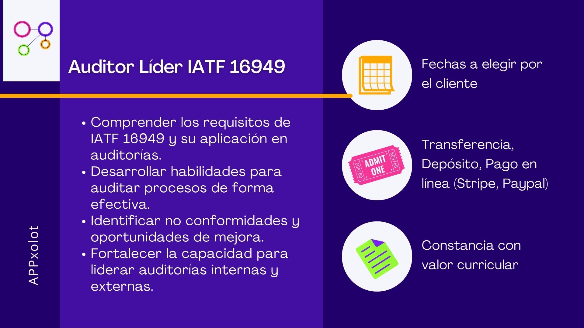 En Appxolot hemos diseñado este Programa de Formación para Auditor Líder IATF 16949 como un campo de entrenamiento de alto rigor técnico. Elevaremos las competencias de tu personal clave para que dominen la interpretación exacta de la norma (integrada con ISO 9001:2015), las directrices internacionales de auditoría (ISO 19011) y el enfoque específico del sector automotriz. A través de simulaciones de auditoría y análisis de casos reales, los participantes aprenderán a planificar, ejecutar y liderar auditorías de primera, segunda y tercera parte, convirtiéndose en el principal escudo protector de tu Sistema de Gestión de Calidad.