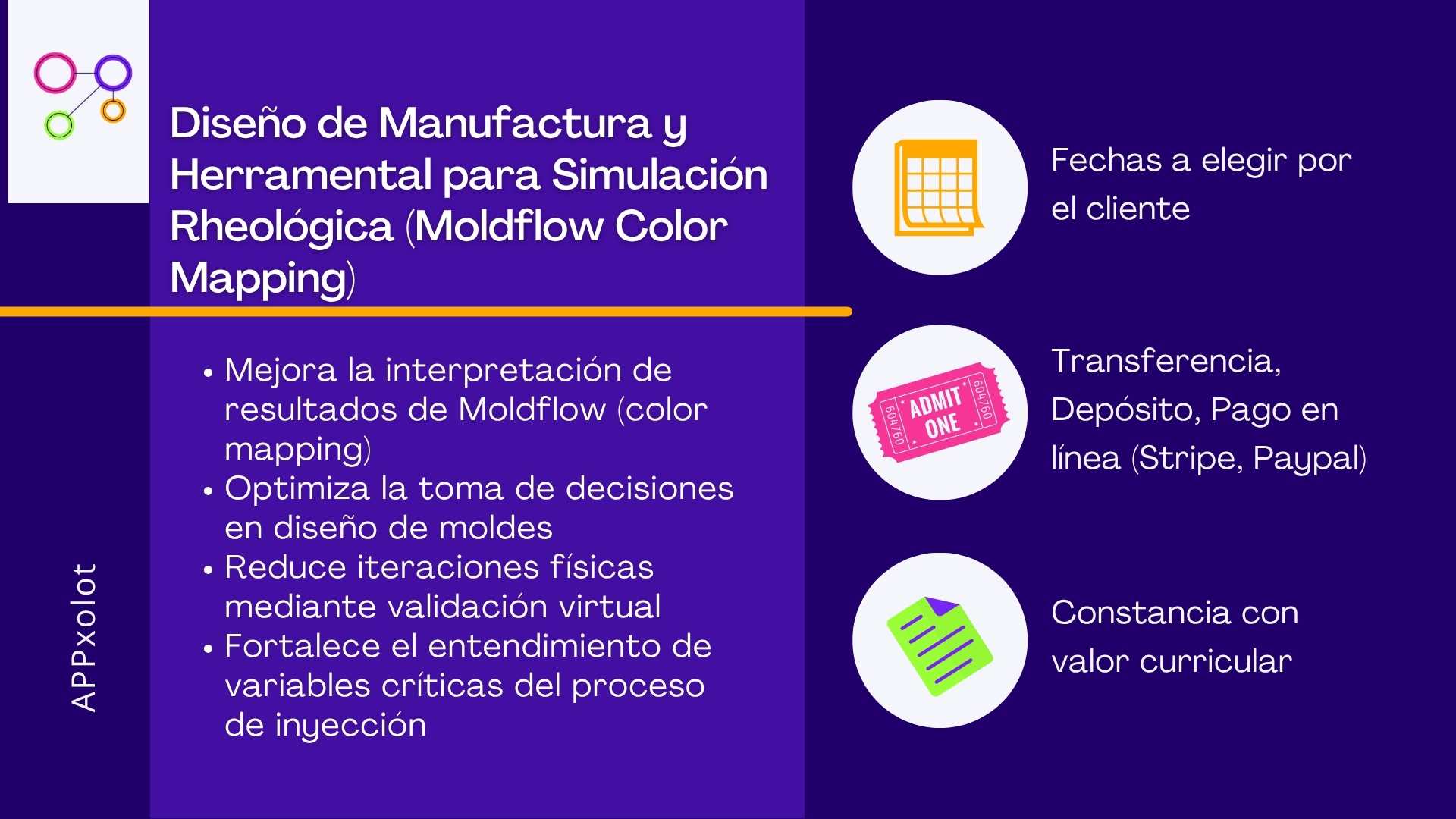 En Appxolot hemos diseñado este Programa de Especialización en Simulación Reológica y Diseño de Herramental para transformar a tus ingenieros en estrategas predictivos. Llevaremos a tu equipo más allá del simple uso del software CAE (Moldflow, Moldex3D, Cadmould). Aprenderán la ciencia detrás del comportamiento del polímero, la configuración exacta de los parámetros de simulación (Fill, Pack, Cool, Warp) y, lo más importante, desarrollarán un ojo clínico para la interpretación de resultados (Color Mapping), permitiéndoles detectar y neutralizar defectos críticos antes de fabricar el molde.